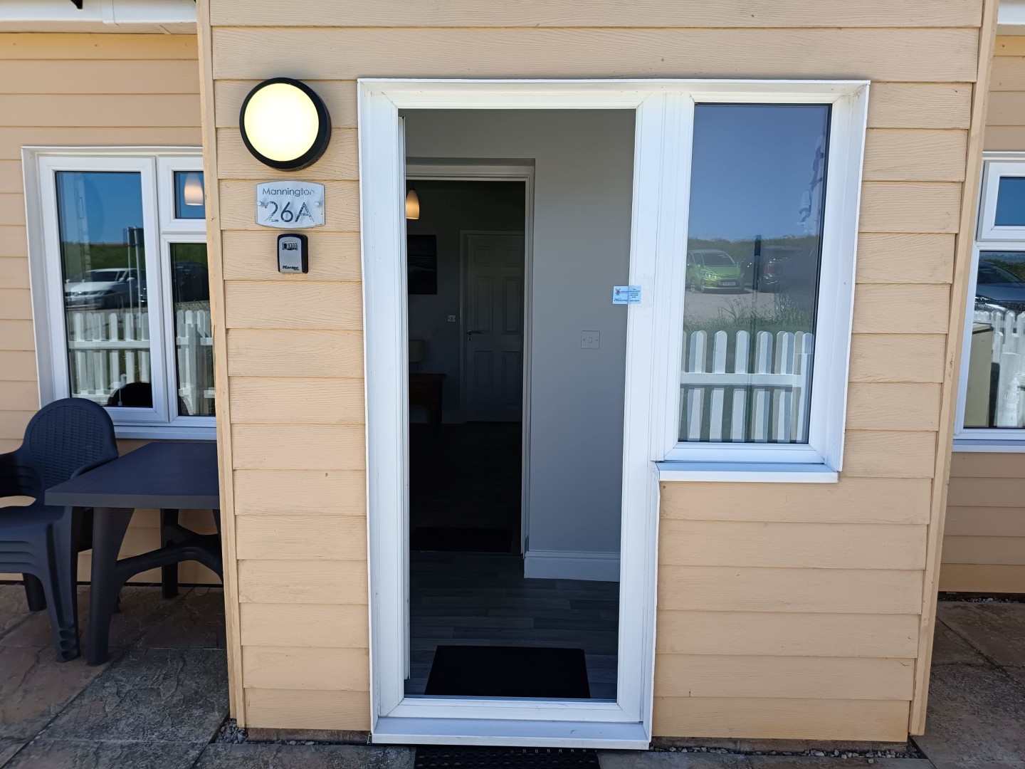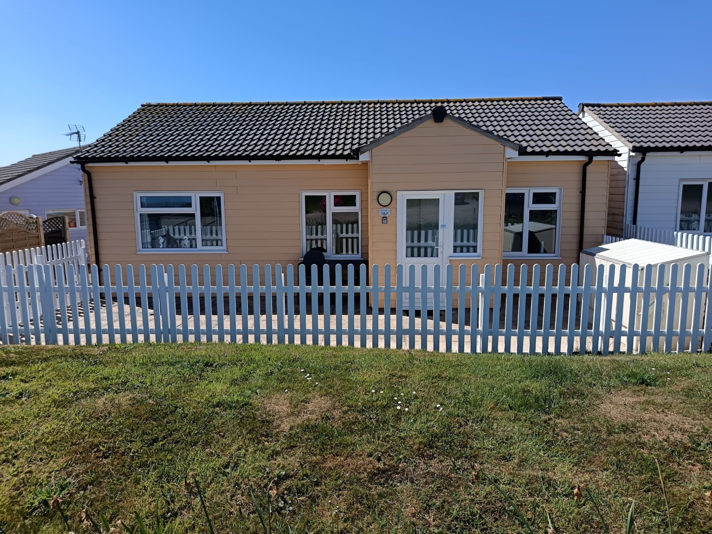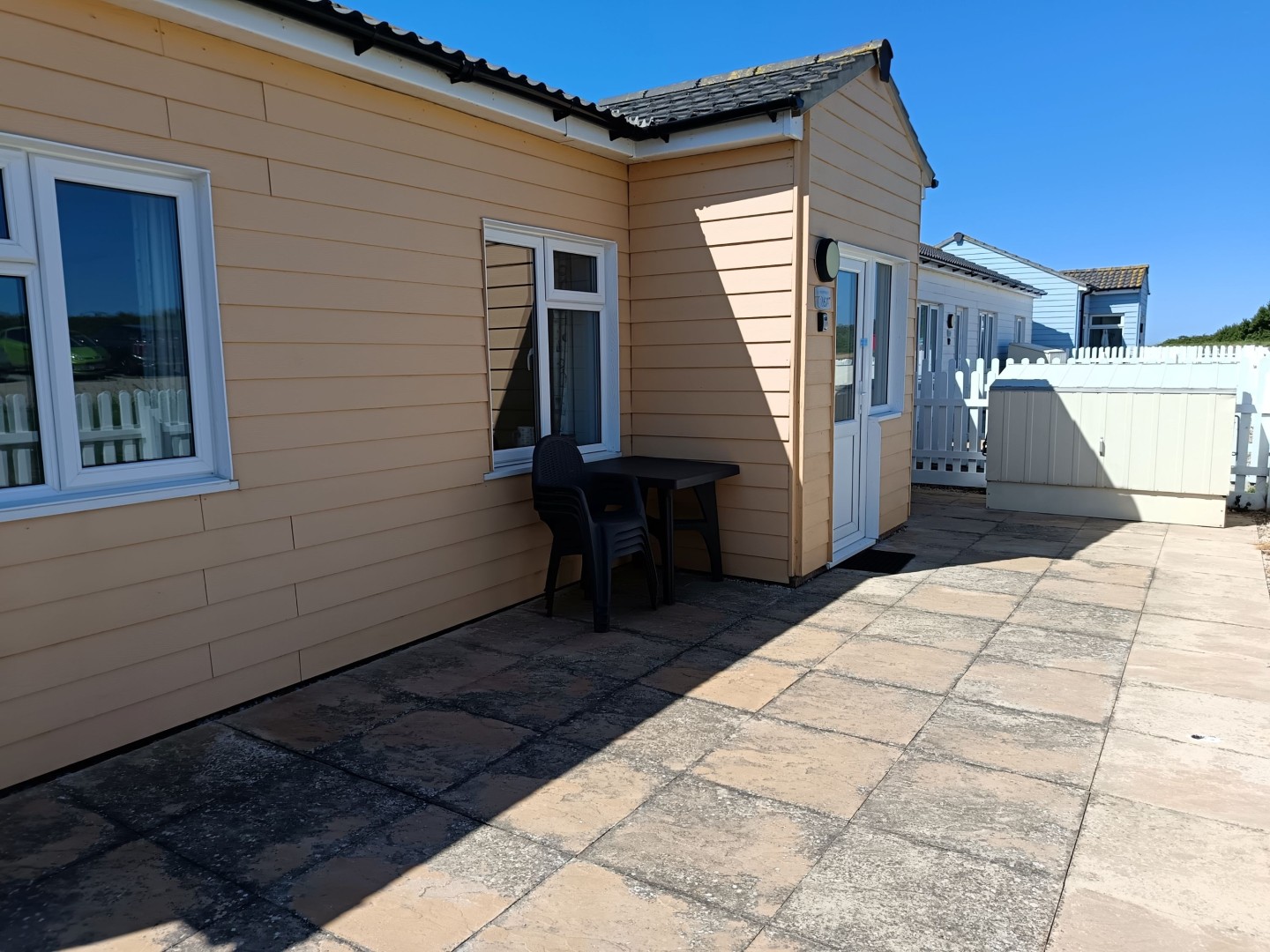 As you can see from the actual photos of this bungalow it comes with its own courtyard with storage shed. This is a lovely area for sitting outside and enjoying the sunshine all day long. Parking is literally a 5 metre walk away.