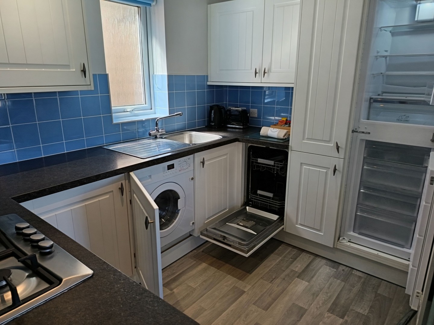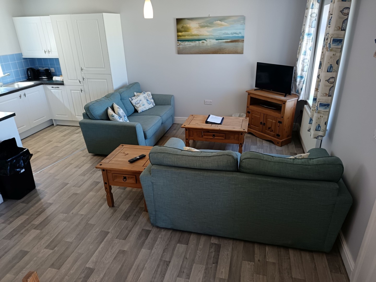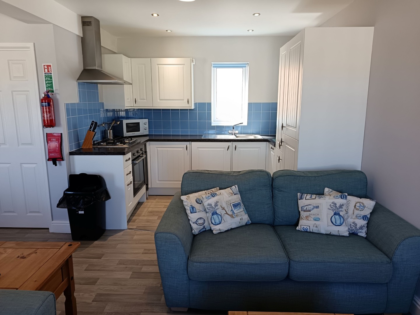 When you approach the front door you will notice there is a bright porch area to take off shoes and coats, after enjoying the coastal walks that are 2 minutes from your doorstep. From the porch you enter the bungalow itself and immediately notice how open plan and roomy it feels. To the left you have your free standing dining room table and chairs and to the right you have your lounge area with 2 sofas, TV and coffee table. Throughout this bungalow you will also get a great feel that you are close to the seaside as the colours are bright and in pastel colours. The kitchen is really well equipped with everything you could wish for fridge freezer, washing machine, dishwasher, oven and grill.